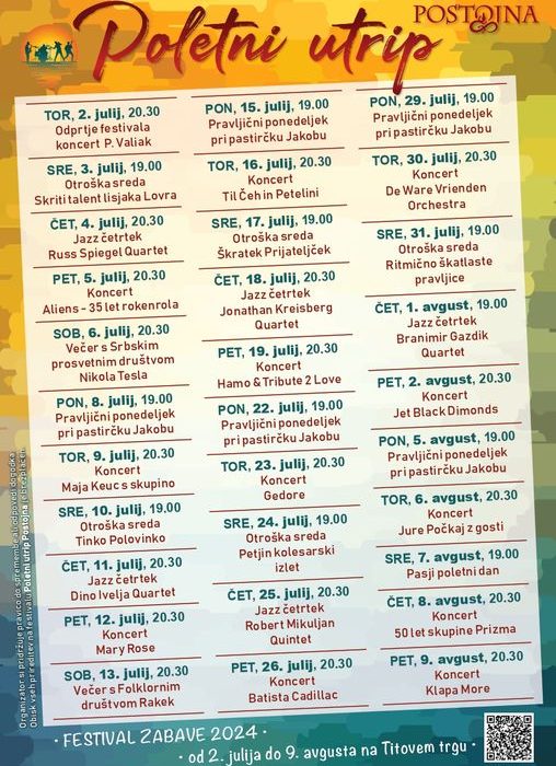 Bogat program brezplačnih kulturnih in glasbenih prireditev je primeren za vse generacije in okuse. Če si želite popestritve v vročih poletnih mesecih, ste vsekakor vabljeni na prijetno druženje na Titovem trgu v Postojni.